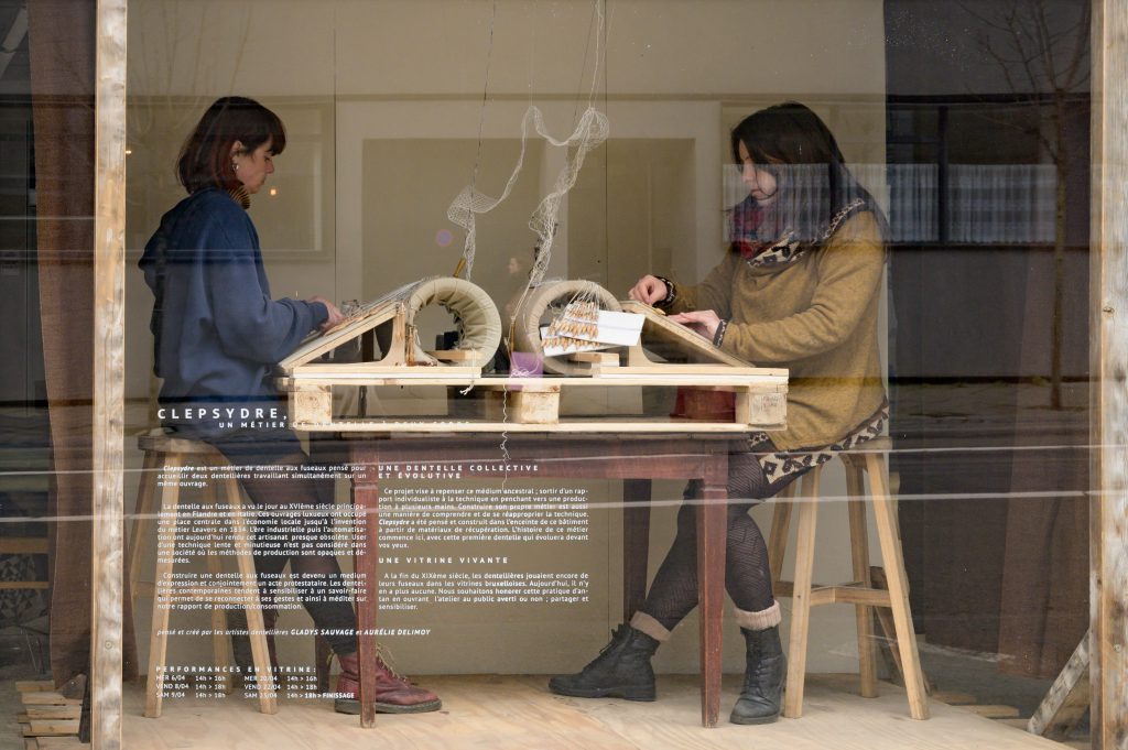 A la fin du XIXème siècle, les dentellières jouaient encore de leurs fuseaux dans les vitrines bruxelloises. Aujourd’hui, il n’y en a plus aucune. Nous souhaitions honorer cette pratique d’antan en ouvrant l’atelier au public averti ou non ; partager et sensibiliser. La dentelle qui surplombe le métier a été réalisée au sein même de la vitrine pendant un mois.