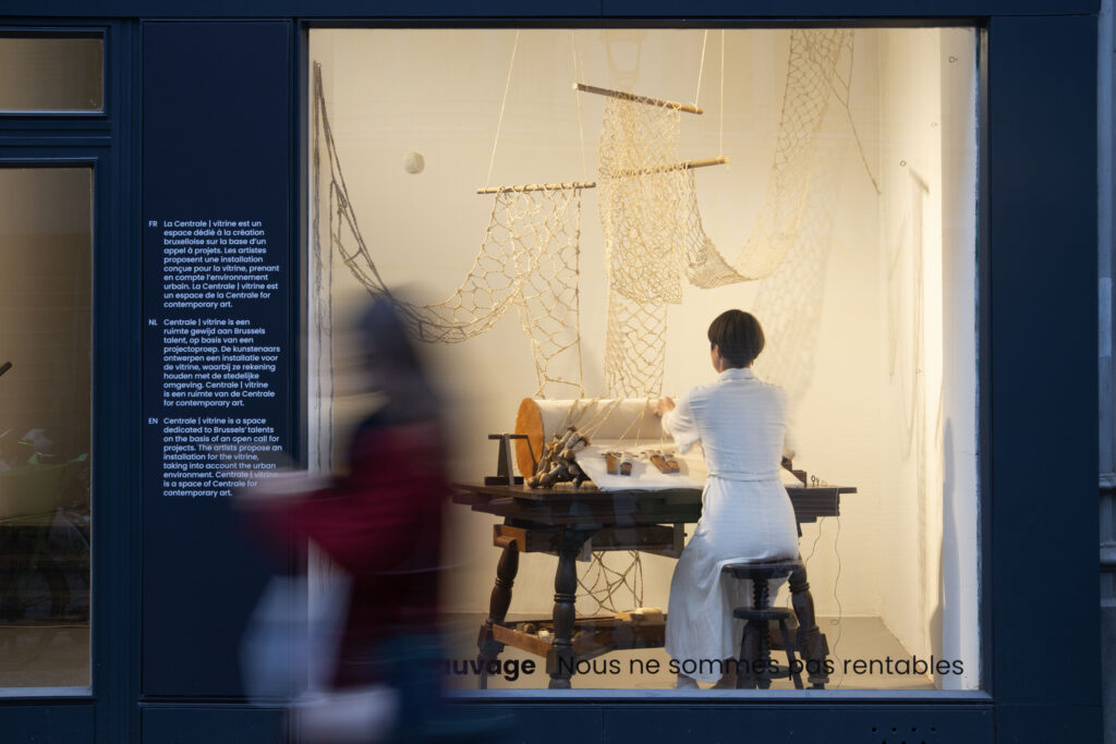 La dentelle ou le mycélium se propage dans la vitrine tout au long de l’exposition. L’artiste y œuvre en temps réel à différents moments : les 19 et 20 septembre, les 9, 10, 11, 12 et 13 octobre et les 13, 14, 15, 16 et 17 novembre 2024. » Centrale for Contemporary art